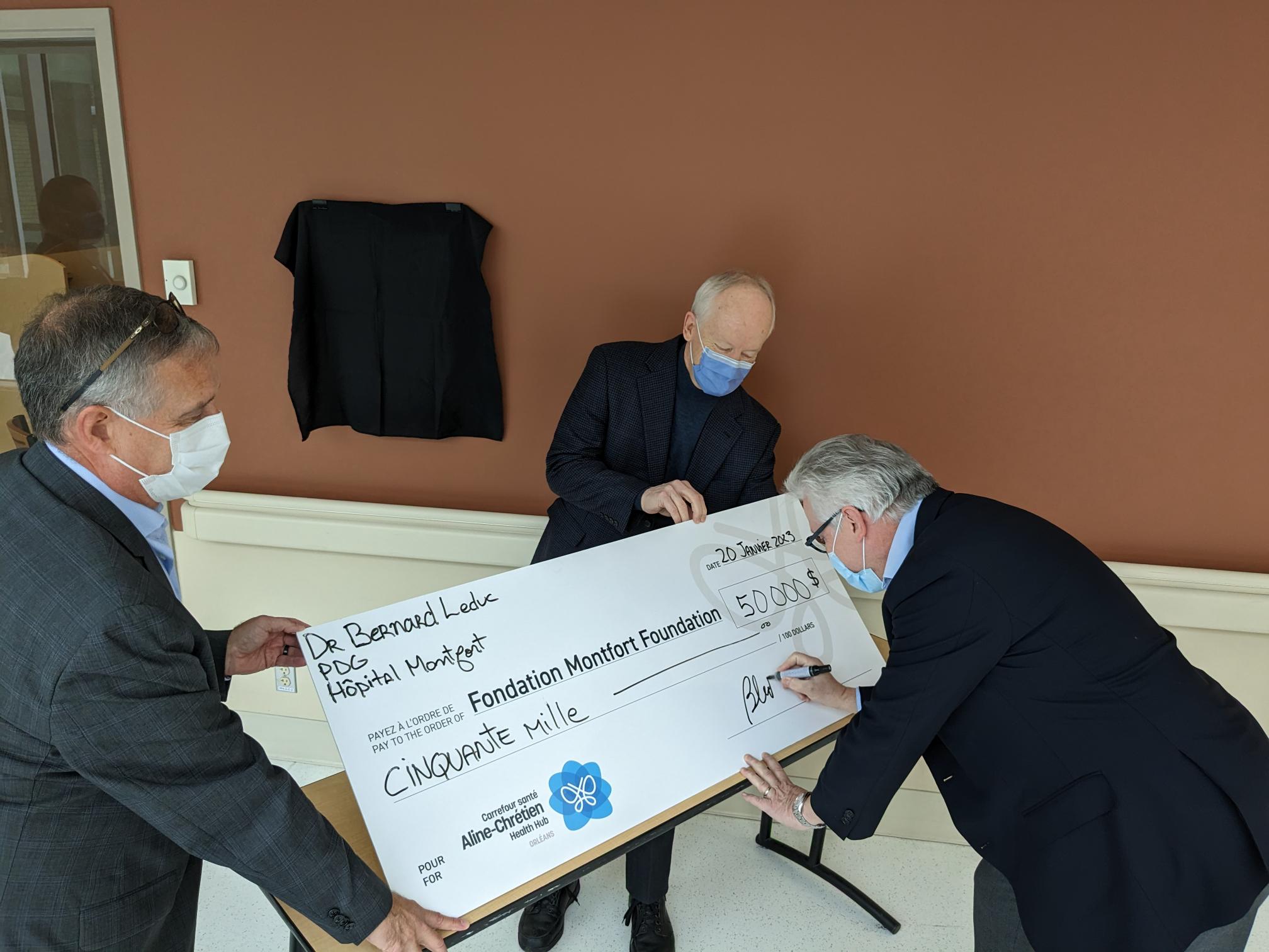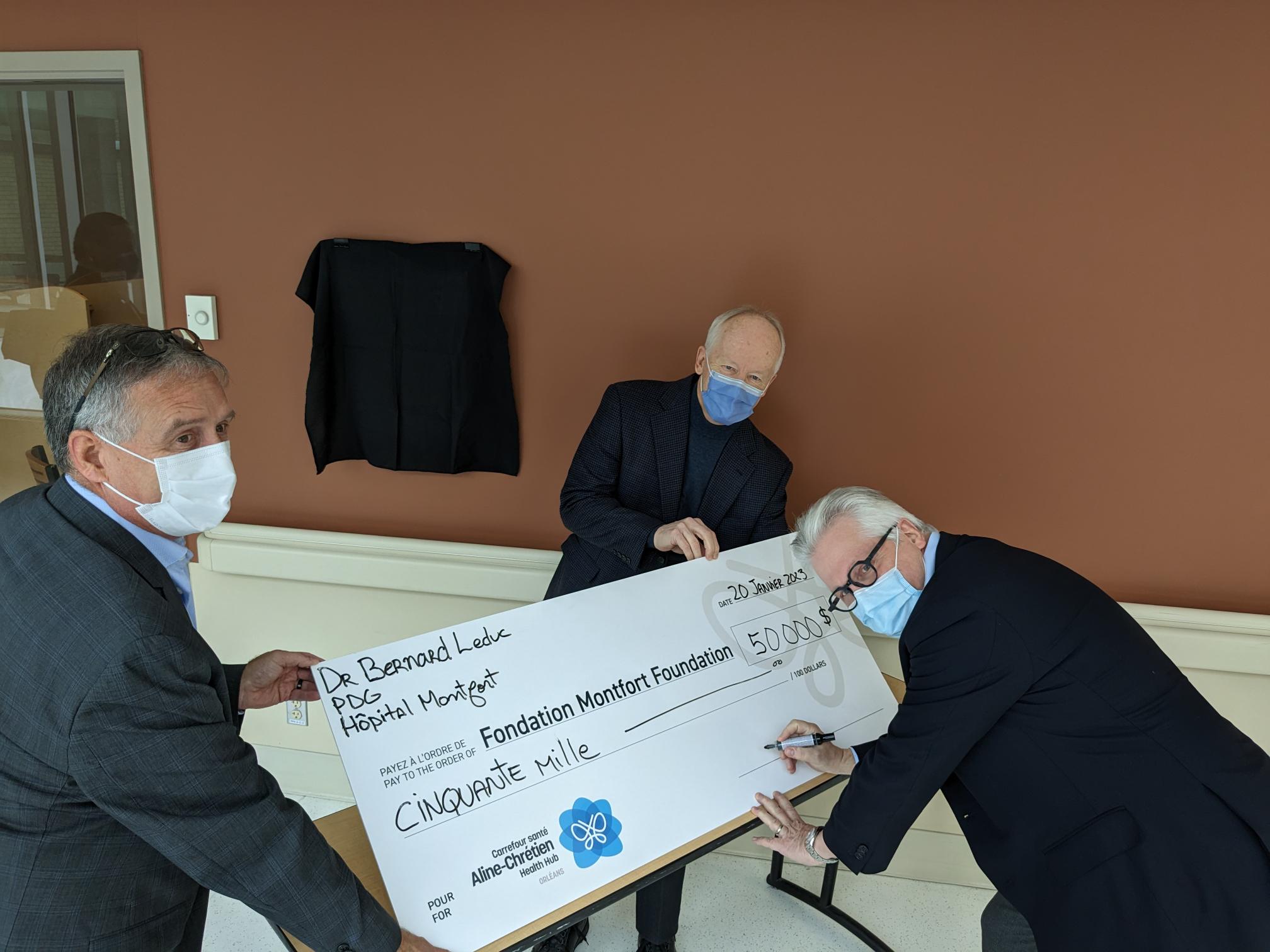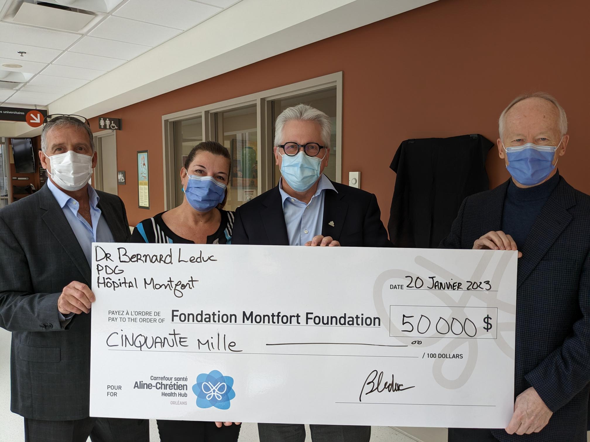 Le 9 septembre 2021, Dr Bernard Leduc s’est engagé auprès de la Fondation Montfort à remettre un don de 50 000 $ envers la campagne de collecte de fonds pour la construction du Carrefour, un projet d’importance qui, selon lui, améliorera grandement la qualité de service en santé dans la région.